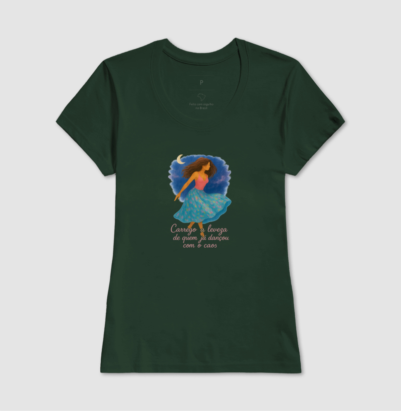 Camiseta Feminina "Leveza e Caos" – Para quem já se reinventou mil vezes Com a frase impactante “Carrego a leveza de quem já dançou com o caos”, essa camiseta é feita para mulheres que transformam dor em força e instabilidade em poesia. Uma peça que expressa resiliência, autenticidade e aquela paz que só vem depois da tempestade. Ideal para quem viveu intensamente, superou e agora caminha com alma leve. Estampa artística, tecido 100% algodão e caimento confortável. Perfeita para quem carrega história no peito.